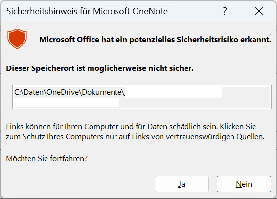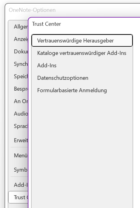 Alle einschl. Quellen verweisen darauf, dass OneNote dieselben Trust-Center-Einstellungen hätte wie Word, PP und XL.