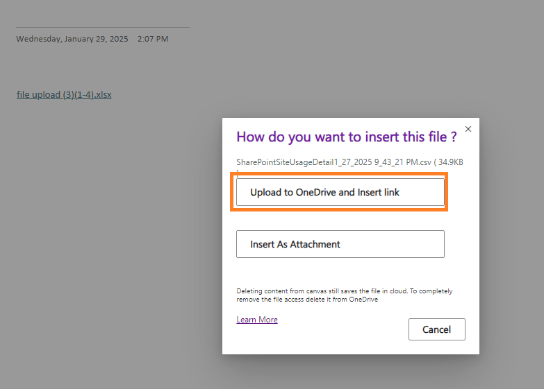 Oder Sie hängen die Excel-Datei als "Auf OneDrive hochladen und Link einfügen" an die OneNote an. Nachdem Sie auf diese Weise hinzugefügt haben, wird Excel Web geöffnet, wenn Sie auf die Datei klicken.
