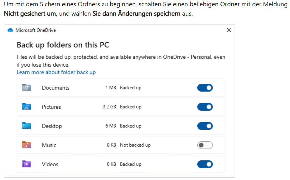 Unter [Sichern Ihrer Ordner mit OneDrive - Microsoft-Support] finden Sie eine Anleitung, wie Sie die Ordnersynchronisierung für OneDrive einrichten können.