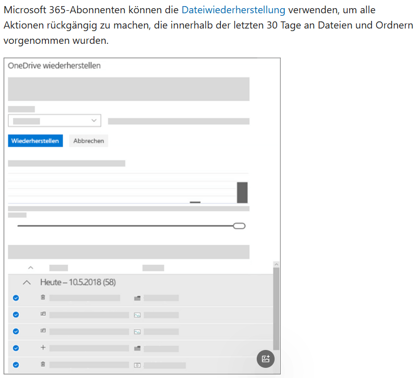 Unter [Wiederherstellen Ihrer OneDrive-Dateien - Microsoft-Support] finden Sie eine Anleitung, wie Sie Dateien wiederherstellen können, die kürzlich von OneDrive gelöscht wurden.