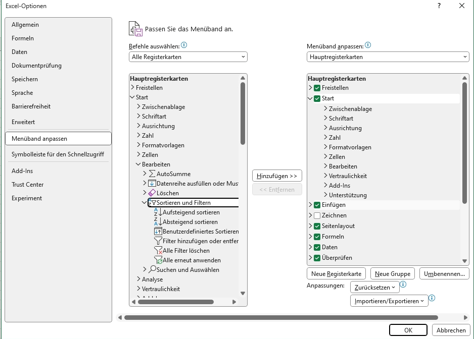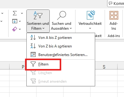 Und Sie haben erwähnt, dass [die Funktion nicht im Auswahlfenster gefunden werden kann], bedeutet das, dass es kein Symbol für die Funktion [Filter] in der Menüleiste gibt? Kann ich die fehlende Funktion manuell über [Menüband anpassen] hinzufügen?