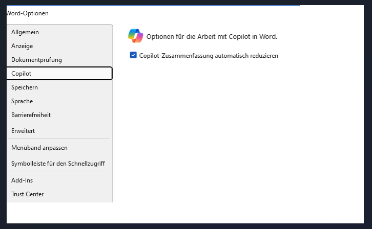 Überprüfen Sie, ob eine Copilot-Registerkarte vorhanden ist. Wenn dies der Fall ist, stellen Sie sicher, dass die Option "Copilot aktivieren" ausgewählt ist.