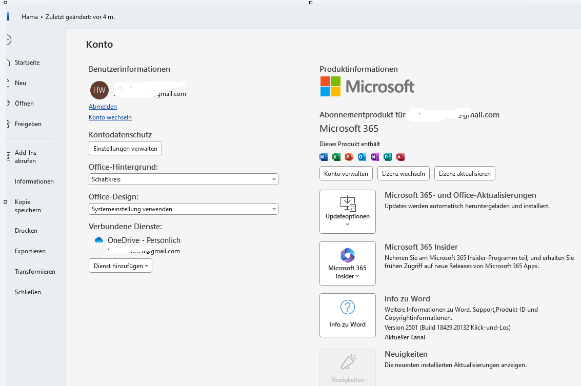 Auf diese Weise können wir überprüfen, ob Ihr Microsoft 365 Family-Abonnement tatsächlich in den Office-Anwendungen aktiviert ist, und auch Ihre Version von Office sehen.