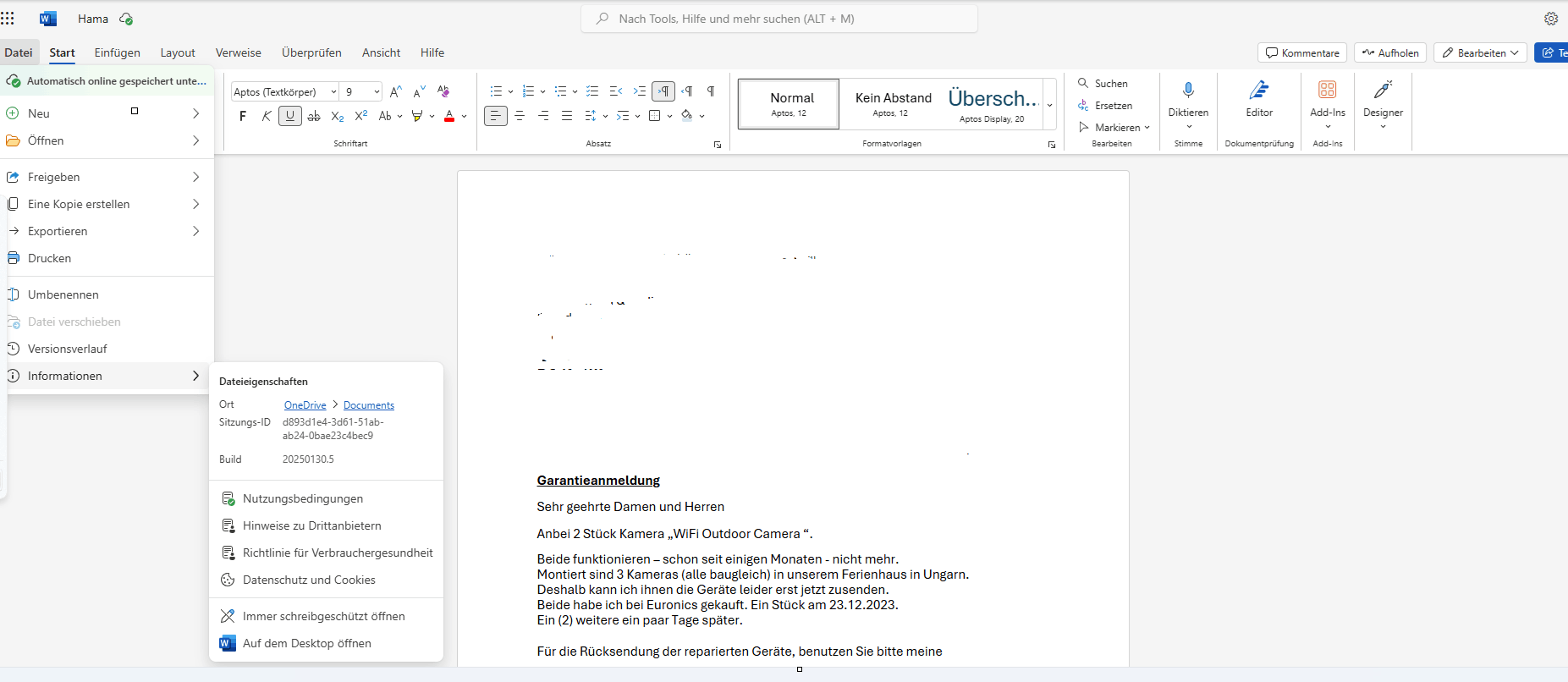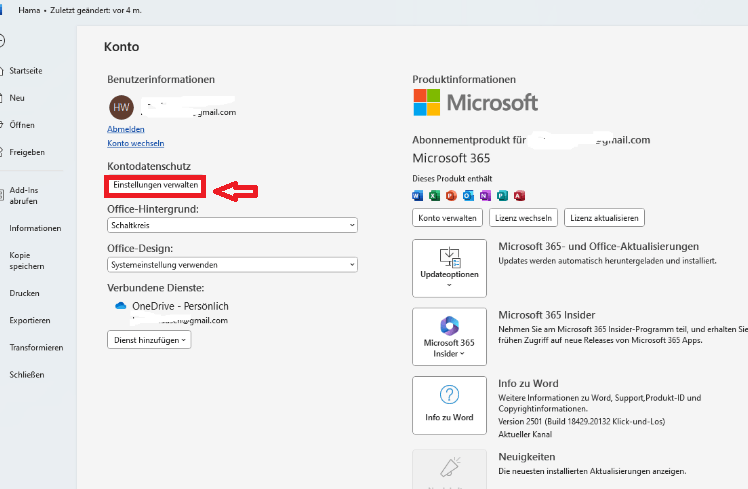 Öffnen Sie eine Word-Datei, > wählen Sie in der oberen linken Ecke Datei aus > wählen Sie Konto aus. Wählen Sie unter "Kontodatenschutz" die Option "Einstellungen verwalten" aus.