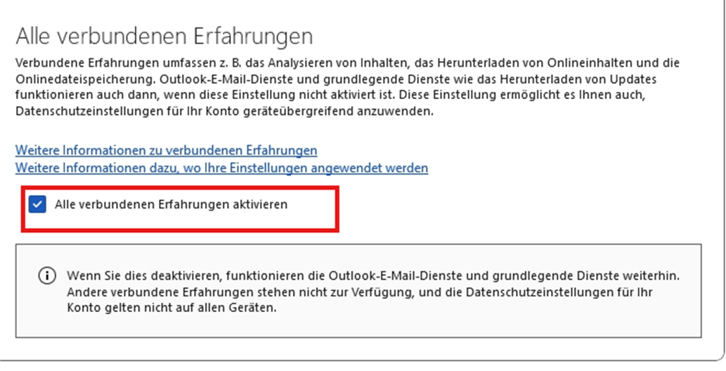 Vergewissern Sie sich, dass alle Optionen für verbundene Erlebnisse ausgewählt sind.