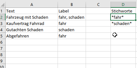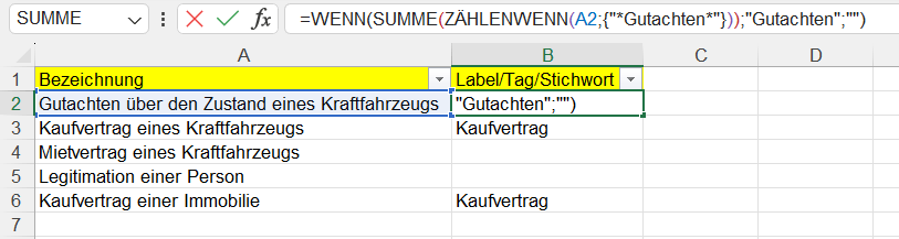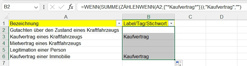 Im vorliegenden Beispiel habe ich die Regel =WENN(SUMME(ZÄHLENWENN(A2;{"*Kaufvertrag*"}));"Kaufvertrag";"") genutzt.