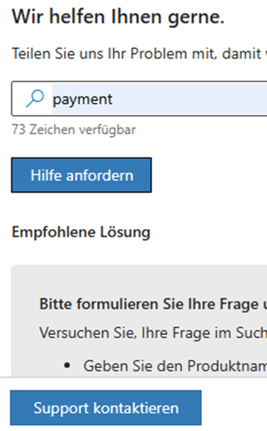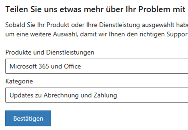 Wählen Sie Support kontaktieren, Sie werden aufgefordert, das Problem unter "Produkte & Services" und "Kategorien" noch einmal zu beschreiben. Klicken Sie auf Bestätigen.