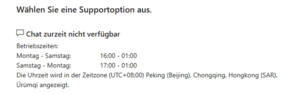 Hinweis: Der Chat-Support ist nur zu bestimmten Zeiten verfügbar. Wenn also im letzten Fenster angezeigt wird, dass es nicht verfügbar ist, versuchen Sie, es am nächsten Tag erneut zu öffnen.
