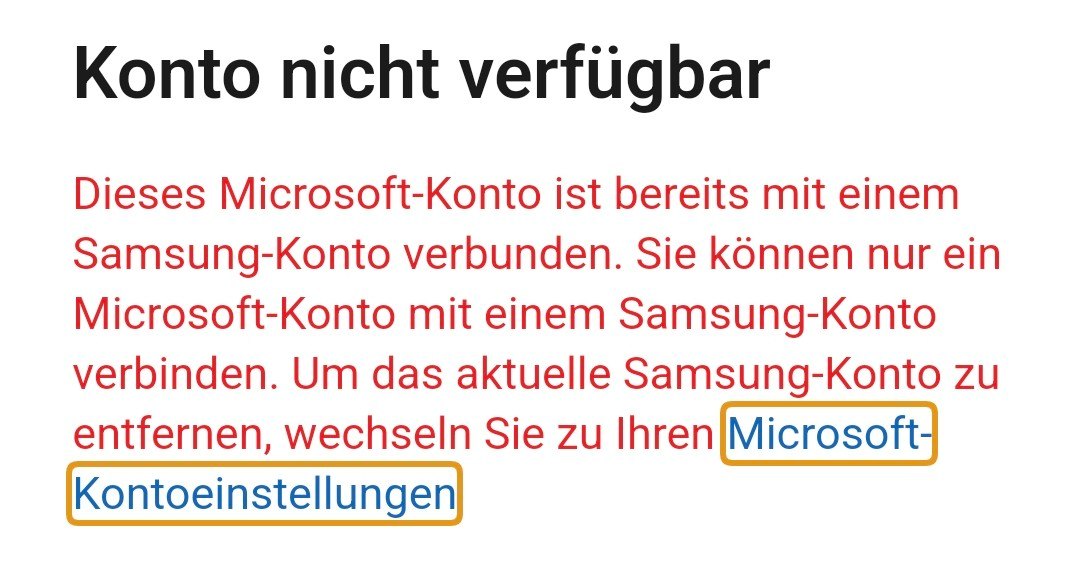 Basierend auf Ihrem Screenshot haben Sie möglicherweise mehrere Samsung-Konten. Ihr Microsoft-Konto ist bereits mit einem Samsung-Konto verknüpft und kann nicht mit einem neuen Samsung-Konto verbunden werden, wodurch dieses Problem verursacht wurde.