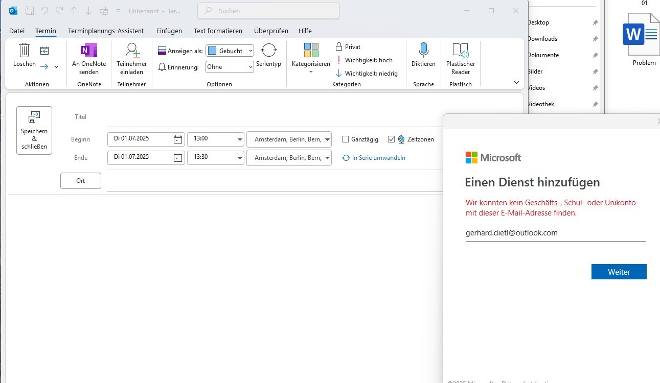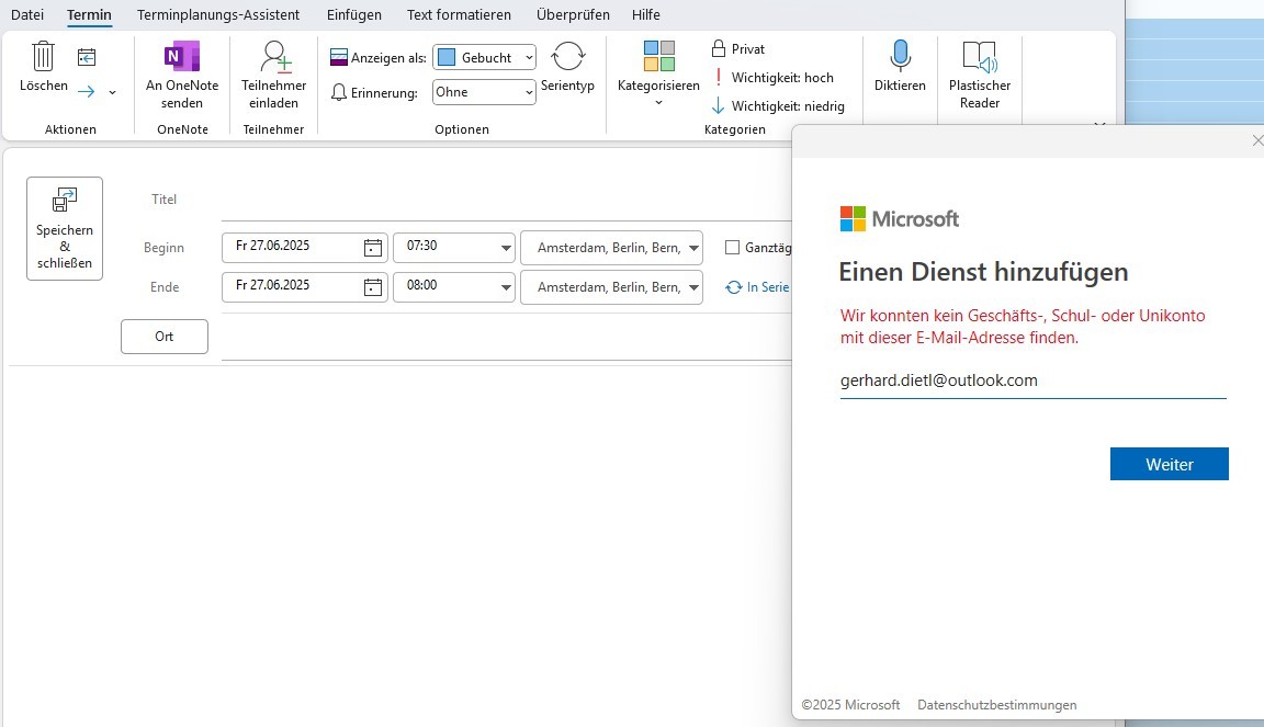 Ich bin Cherrelyn, eine unabhängige Beraterin. Vielen Dank für die ausführliche Erklärung und die Screenshots, das ist wirklich hilfreich. Meiner Ansicht nach liegt das Problem wahrscheinlich an der Nichtübereinstimmung der Kontotypen in Outlook: