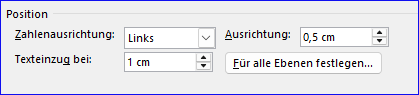 - Drittens sind Einzüge nicht unter "Absatz" festzulegen, sondern in der Listenformatvorlage zu "Position":