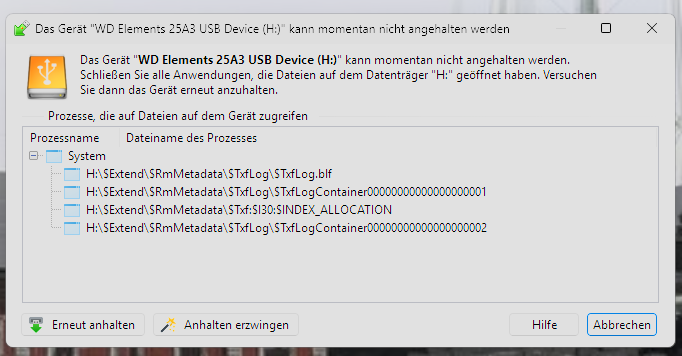 auch meine andere FEetplatte und ein getesteter USB-Stick lassen sich nciht sicher entfernen.