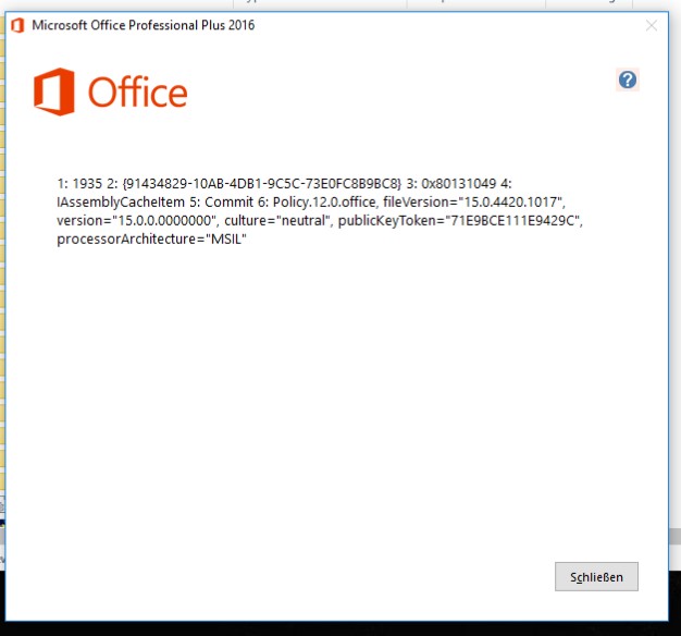 1: 1935 2: {91434829-10AB-4DB1-9C5C-73E0FC8B9BC8} 3: 0x80131049 4: IAssemblyCacheltern 5: Commit 6: Policy.12.0.office, fileVersion="15.0.4420.1017", version="15.0.0.0000000", culture="neutral", publicKeyToken="71E9BCE111E9429C", processorArchitecture="MSIL"