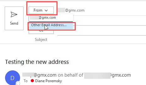 Da ich meine Aliase sehe, kann ich eine neue Nachricht öffnen und dann unter dem Banner „Neue Nachricht“ oben auf dem Bildschirm meine aktuelle Absenderadresse finden. Rechts neben dieser Adresse befindet sich ein kleiner Abwärtspfeil, der wie "v" aussieht. Wenn ich darauf tippe, kann ich die Von-Adresse aus meiner Alias-Liste auswählen.