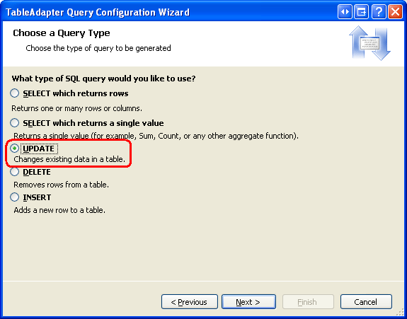 Jetzt müssen wir die UPDATE SQL-Anweisung angeben. Der Assistent schlägt automatisch eine UPDATE Anweisung vor, die der Hauptabfrage des TableAdapter entspricht (eine, die die Werte von CategoryName, Description und BrochurePath aktualisiert). Ändern Sie die Anweisung so, dass die Picture Spalte zusammen mit einem @Picture Parameter enthalten ist, z. B.: