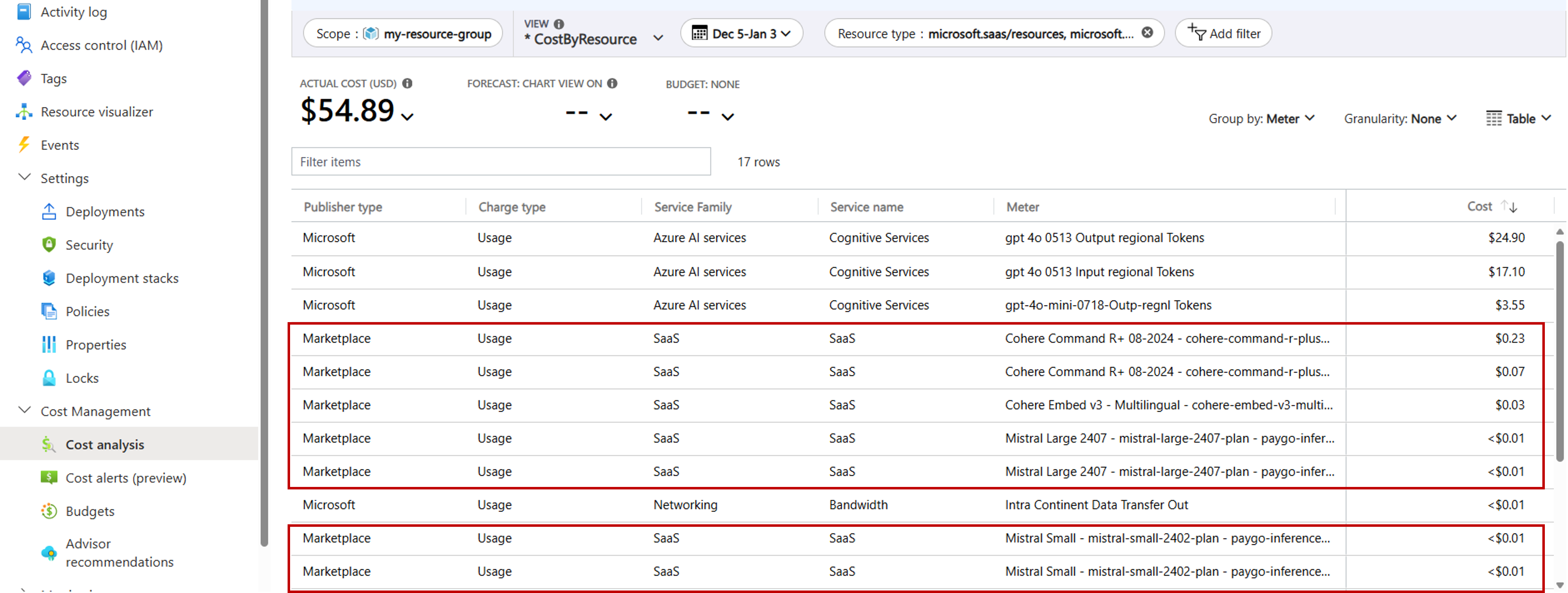 Modelle, die von Drittanbietern wie Cohere bereitgestellt werden, werden mit Azure Marketplace in Rechnung gestellt. Im Gegensatz zu den Abrechnungszählern von Microsoft sind diese Einträge der Ressourcengruppe zugeordnet, in der Ihre Foundry-Ressource bereitgestellt wird, anstatt direkt der Foundry-Ressource selbst. Da Ihnen die Modellanbieter die Kosten direkt in Rechnung stellen, werden die Eingaben und Ausgaben für jedes genutzte Modell unter der Kategorie Marketplace und DienstnameSaaS aufgeführt.