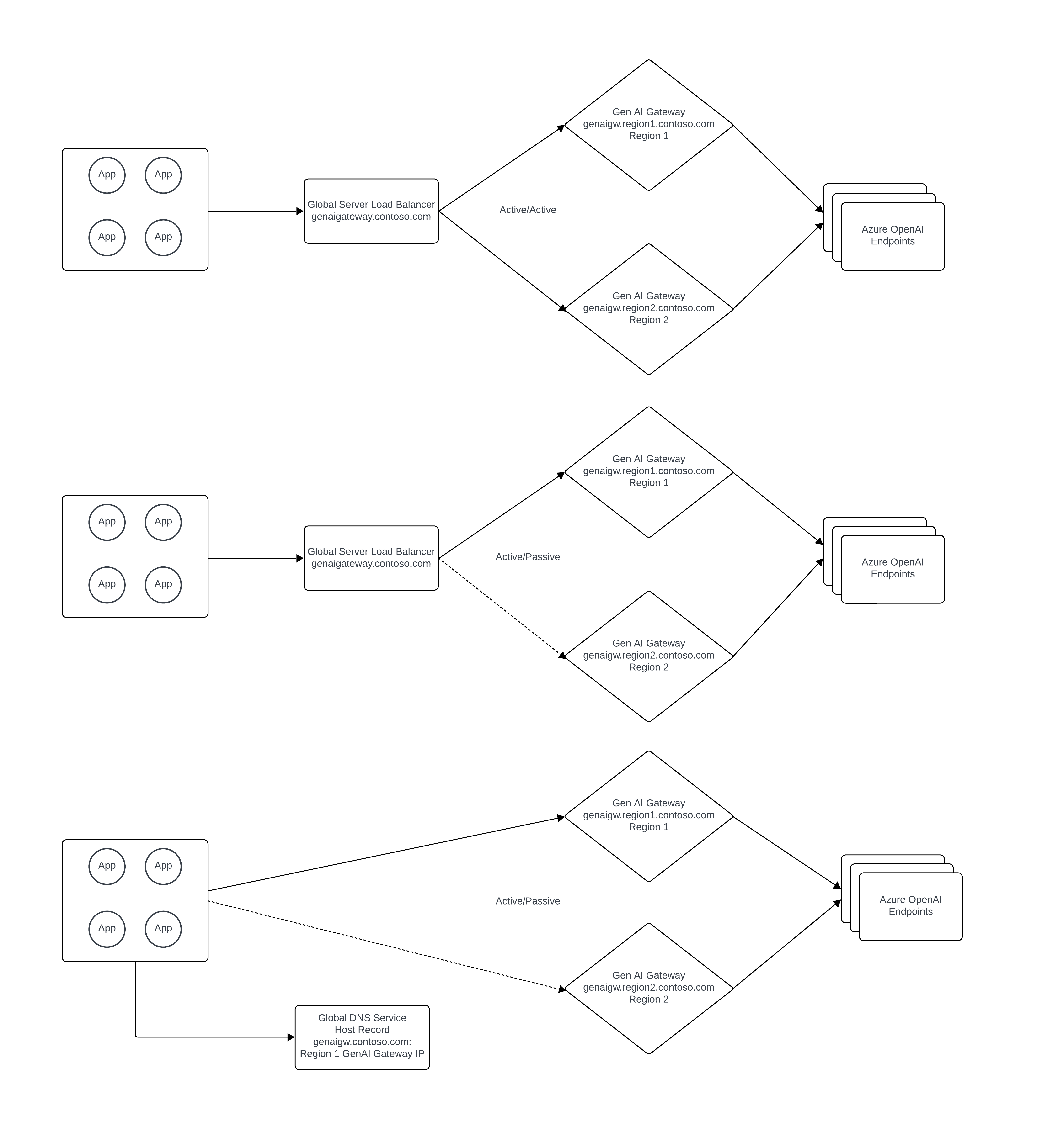 - Ein privater globaler Serverlastenausgleich sollte zum Lastenausgleich über mehrere generative KI-Gatewayinstanzen hinweg verwendet werden, entweder aktiv/aktiv oder aktiv/passiv. Azure hat keinen nativen Dienst für den globalen Serverlastenausgleich für Workloads, die eine Auflösung von privatem DNS erfordern. Weitere Informationen zu diesem Thema finden Sie in diesem inoffiziellen Leitfaden: https://github.com/adstuart/azure-crossregion-private-lb. Anstelle eines globalen Serverlastenausgleichs können Organisationen ein aktives/passives Muster durch Umschalten des DNS-Eintrags für das generative AI-Gateway erreichen.