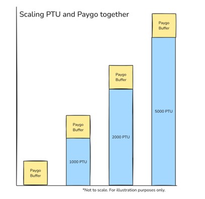 Der andere Vorteil dieser Architektur besteht darin, dass Sie Standardbereitstellungen mit bereitgestellten Bereitstellungen stapeln können, sodass Sie sich in Ihr bevorzugtes Leistungs- und Resilienzniveau einwählen können. Auf diese Weise können Sie PTU für die Grundnachfrage über Workloads hinweg verwenden und die nutzungsbasierte Standardbereitstellung für Spitzen im Datenverkehr nutzen.