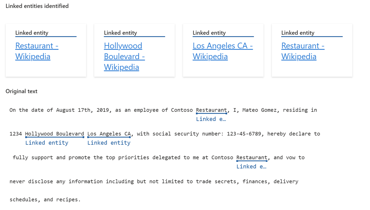 Die Entitätsverknüpfung ist ein vorkonfiguriertes Feature, das die Identität von Entitäten (Wörtern oder Ausdrücken), die in unstrukturiertem Text gefunden werden, eindeutig zuordnet und Links zu Wikipedia zurückgibt.