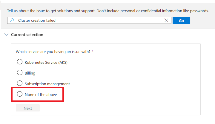 Wenn Azure Kubernetes-Dienst auf Azure Local nicht in der Liste der vordefinierten Dienste angezeigt wird, wählen Sie "Keine der oben genannten" aus.
