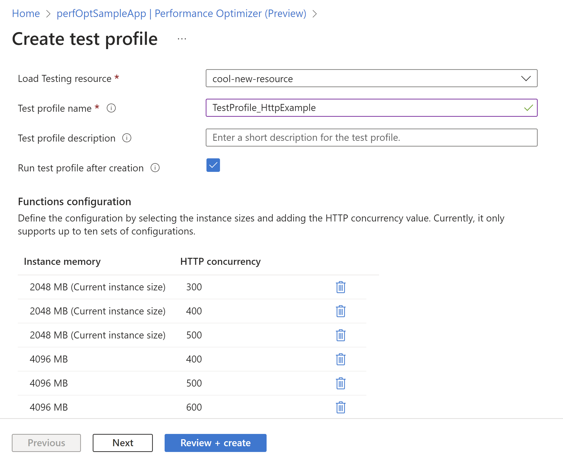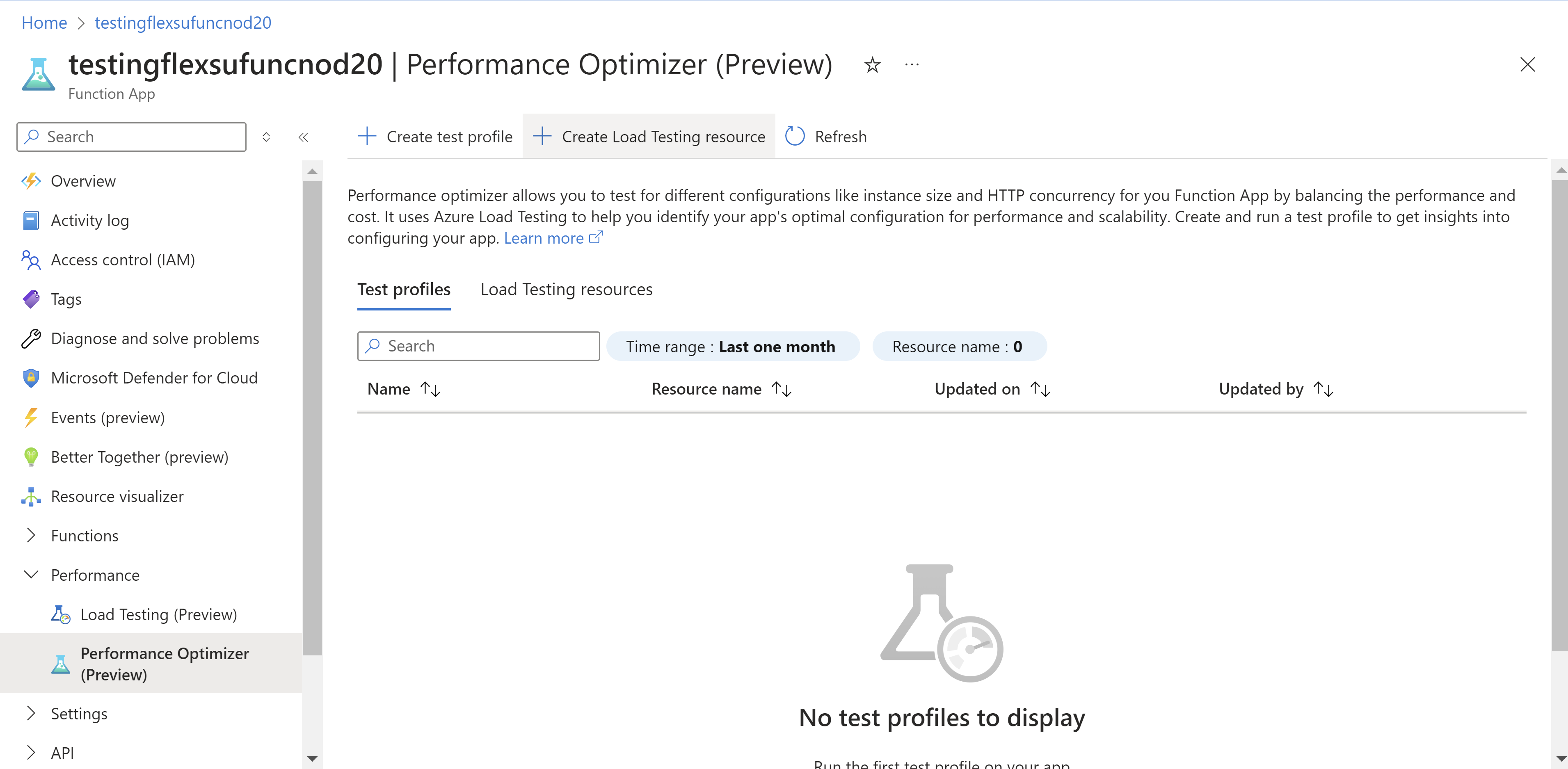 Mit der Leistungsoptimierung können Sie verschiedene Konfigurationen testen, um das richtige Verhältnis zwischen Leistung und Kosten zu ermitteln. Sie können beispielsweise Metriken wie Instanzgröße und HTTP-Parallelitätsumfang für Ihre Functions-App testen. Die Leistungsoptimierung verwendet Azure Load Testing, um die optimale Konfiguration Ihrer App hinsichtlich Leistung und Skalierbarkeit zu identifizieren. Sie können die Leistungsoptimierung für Ihre Funktionen mit HTTP-Triggern ausführen. Nachdem Sie Ihren Code in Azure Functions bereitgestellt haben, führen Sie die folgenden Schritte aus, um die Optimierung auszuführen.