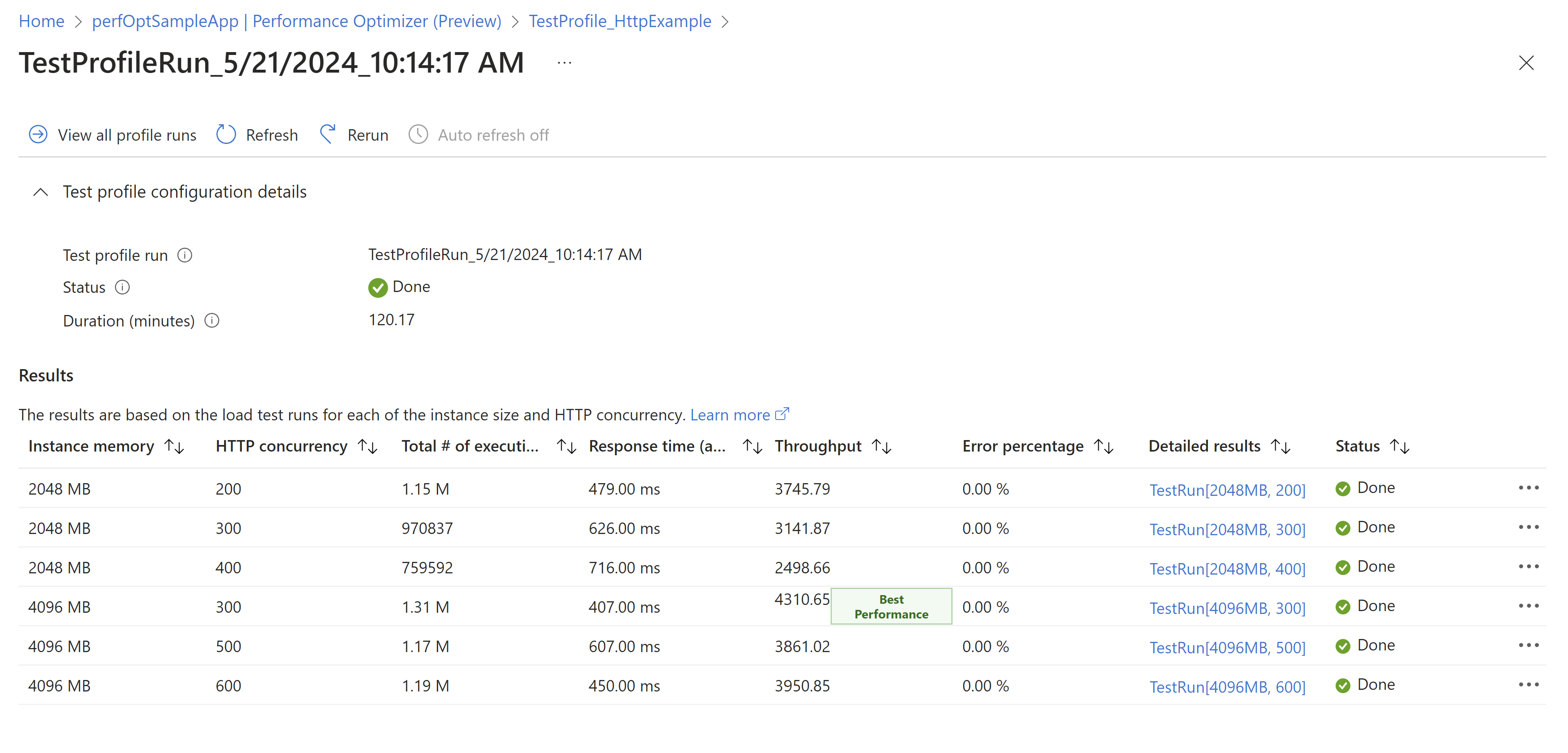 Nach Abschluss der Testprofilausführung können Sie die Ergebnisse im Azure-Portal anzeigen. Die Testprofilausführung enthält die Auslastungstestläufe für jede Functions-App-Konfiguration. Die Ergebnisse umfassen Leistungsmetriken wie Antwortzeit, Durchsatz und Fehlerrate für jede Funktions-App-Konfiguration. Sie können die Leistungsmetriken für verschiedene Konfigurationen vergleichen und die richtige Konfiguration für Ihre App auswählen. Nachdem Sie die optimale Konfiguration ausgewählt haben, wählen Sie Anwenden aus, um die Skalierungs- und Parallelitätseinstellungen auf Ihre Functions-App anzuwenden.