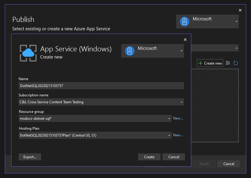 - Wählen Sie Erstellen aus, um das ursprüngliche Dialogfeld zu schließen. Visual Studio erstellt die App Service-Ressource in Azure.