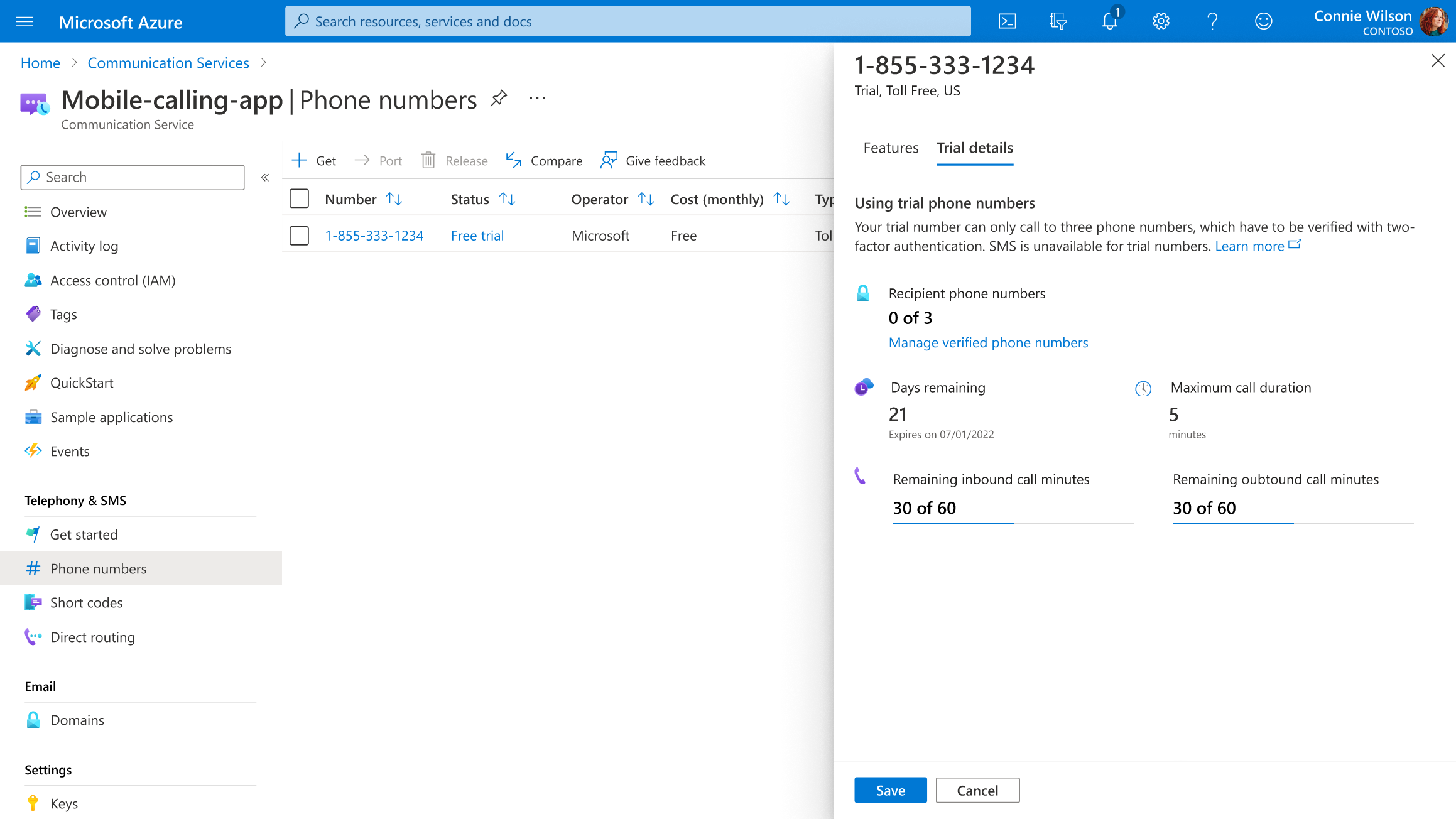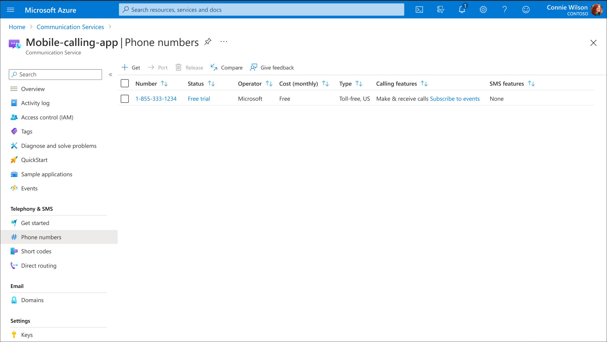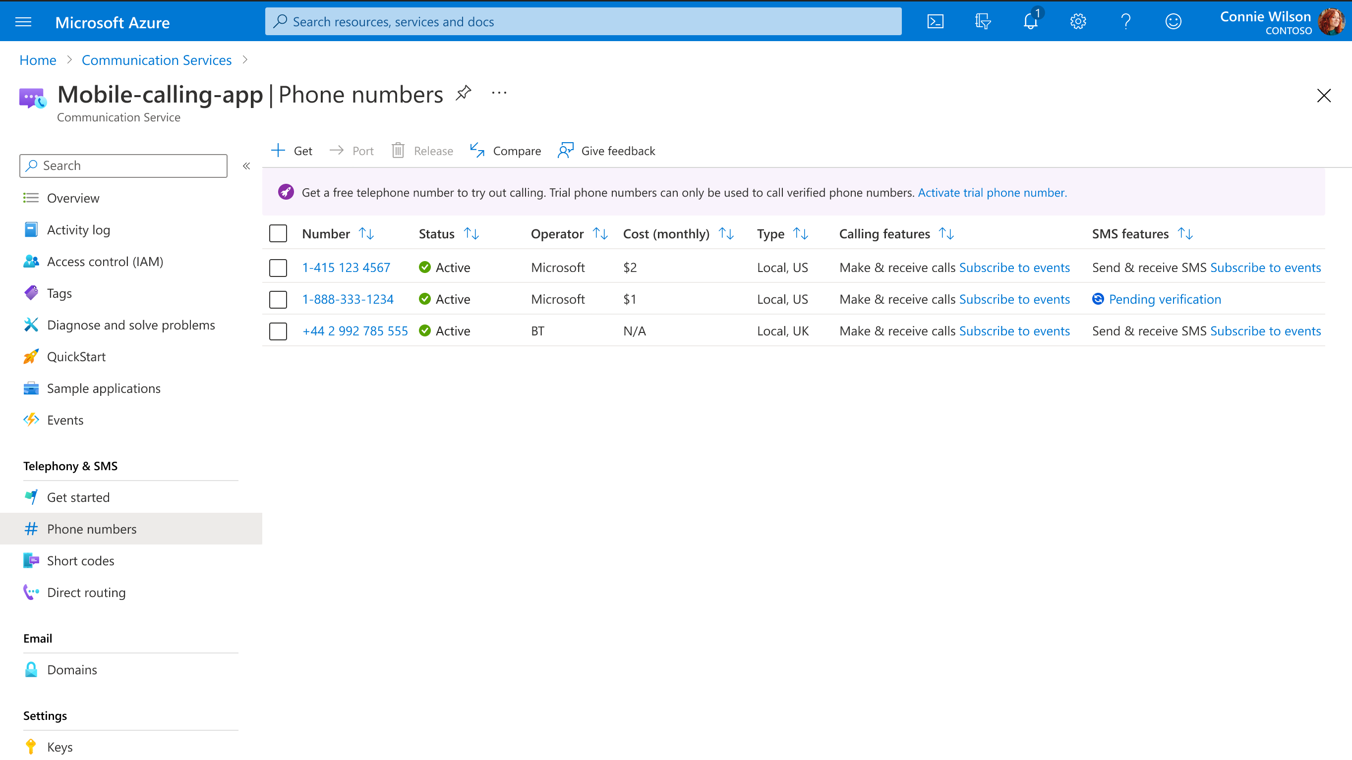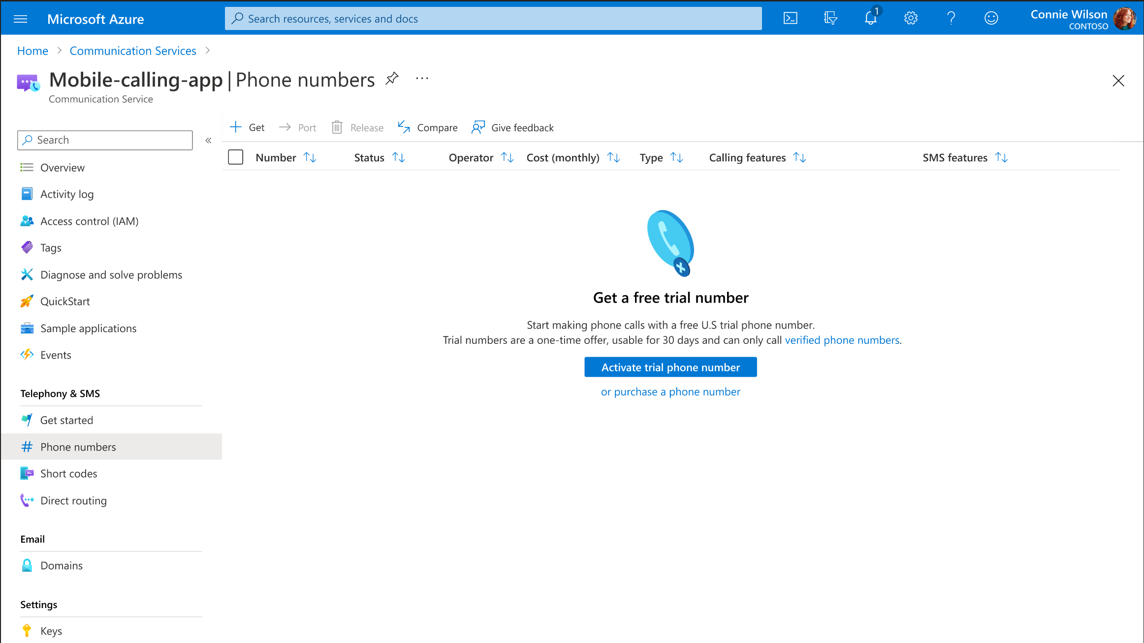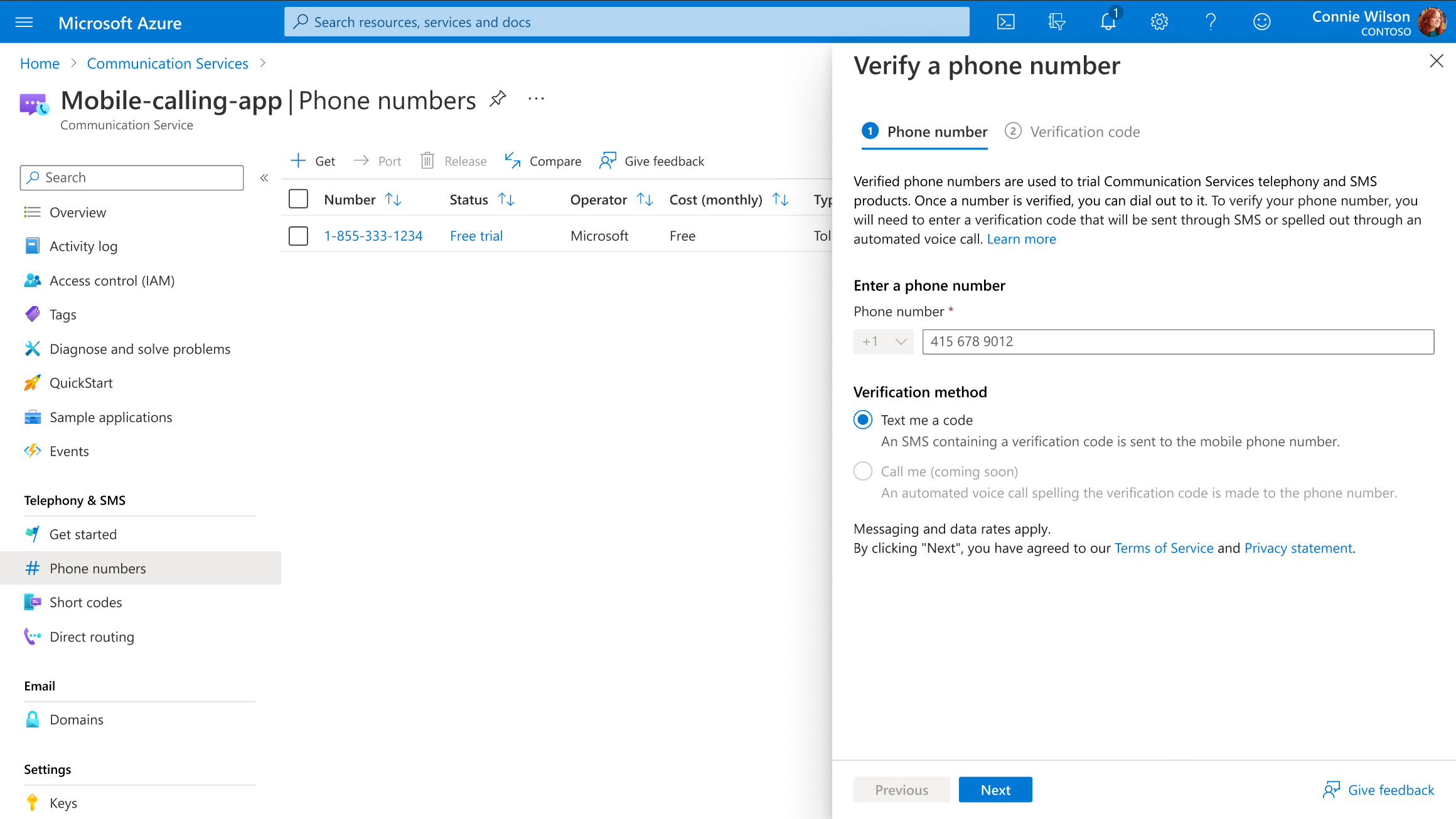 Wenn Sie bereits Über Telefonnummern für Ihre Kommunikationsdiensteressource verfügen, können Sie auch eine Testtelefonnummer aktivieren: