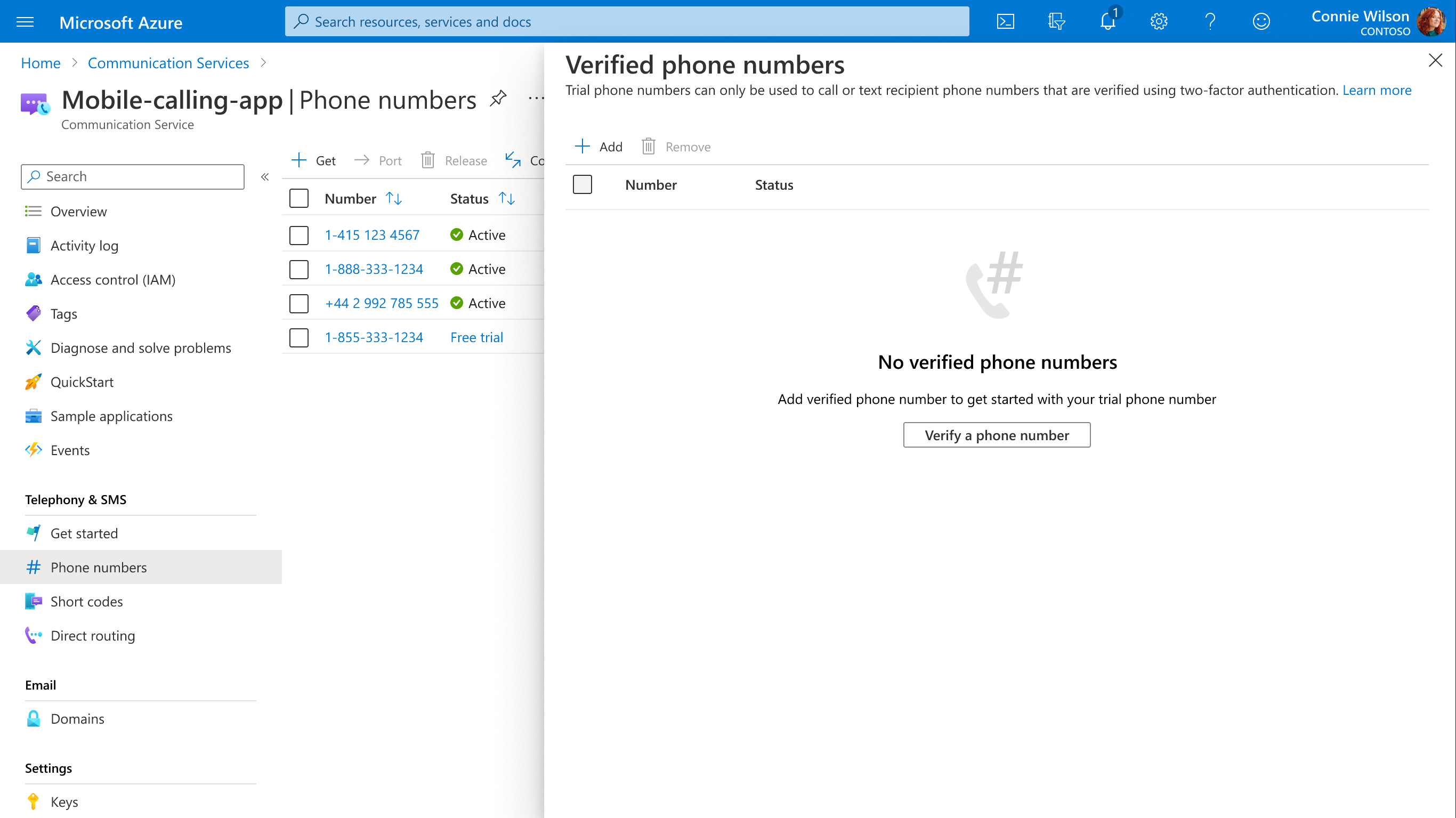 Diese Registerkarte zeigt die aktuellen Einschränkungen für die Nummer, einschließlich der Tage, an denen die Nummer verwendet werden soll, die Gesamtzahl der Anrufminuten und die Anzahl überprüfter Telefonnummern an die Testtelefonnummer angefügt werden. Weitere Informationen zu den Einschränkungen der Testtelefonnummer finden Sie hier.Wählen Sie "Überprüfte Telefonnummern verwalten" aus, um mit dem Hinzufügen überprüfter Telefonnummern zu beginnen.