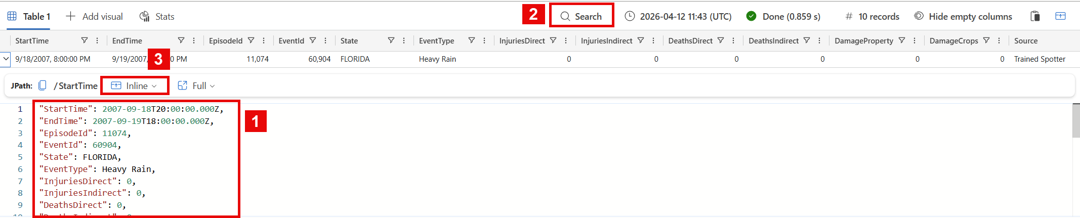 StormEvents | where DamageProperty > 5000 | take 1000Wählen Sie im oberen Menü des Ergebnisrasters auf der rechten Seite "Suchen" aus, und geben Sie "Wabash" ein.