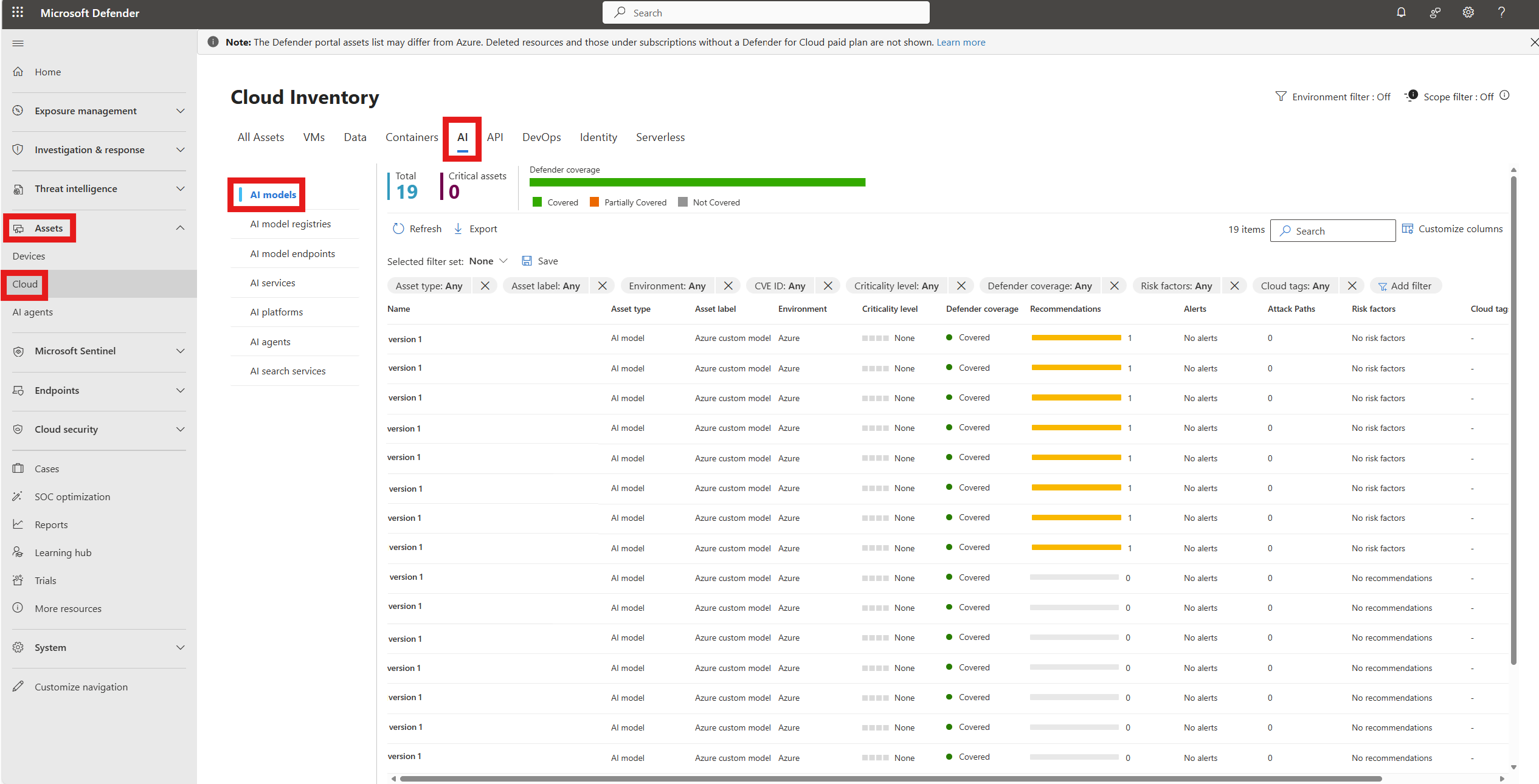 Die Seite " Defender-Portalressourcen " bietet eine umfassende Ansicht aller KI-Modelle in Ihrer Umgebung.