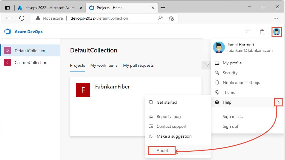 Suchen Sie die Versionsnummer für Azure DevOps Server, indem Sie die folgenden Schritte auf der Benutzeroberfläche ausführen: