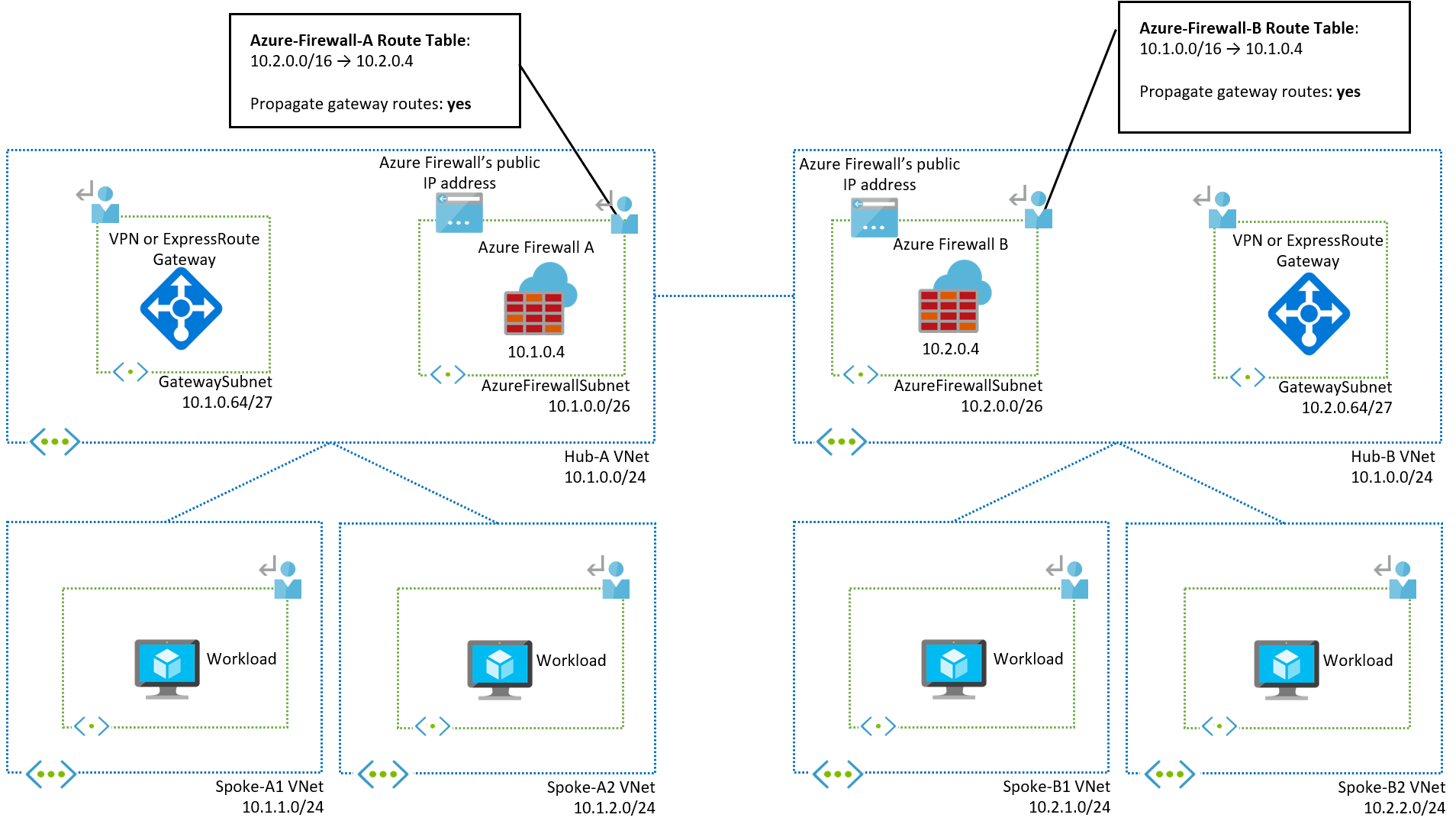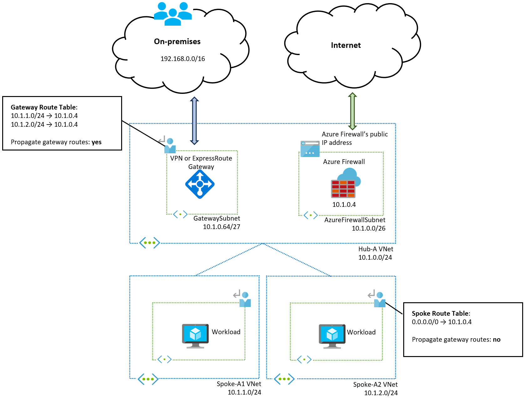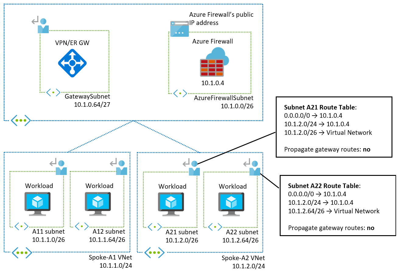 10.1.0.0/24in diesem Beispiel) setzt die Systemroute für das virtuelle Hubnetzwerk außer Kraft. Dies führt dazu, dass der Datenverkehr zwischen dem VPN- oder ExpressRoute-Gateway innerhalb des Subnetzs an die Firewall gesendet wird, wodurch der Gatewaybetrieb möglicherweise unterbrochen wird. -