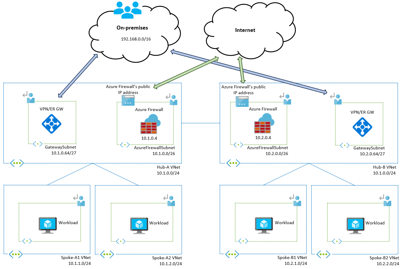 Nachdem Sie verstanden haben, wie der Datenverkehr innerhalb einer einzelnen Hub-and-Spoke-Region funktioniert, ist die Erweiterung des Designs auf eine Architektur mit mehreren Regionen einfach. Das folgende Diagramm zeigt ein aktualisiertes Netzwerkdesign mit Hubs in zwei Regionen (A und B):