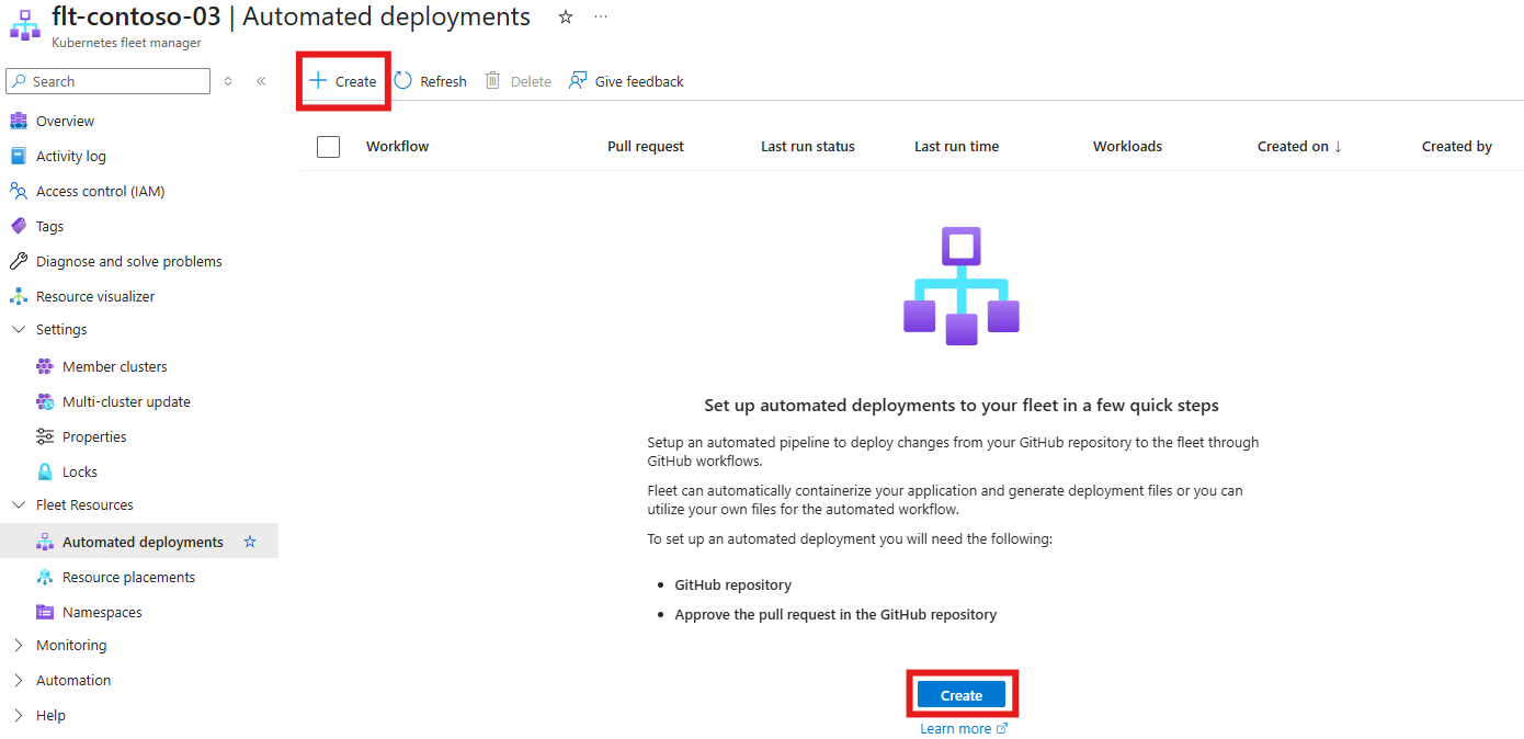 Automatisierte Bereitstellungen von Azure Kubernetes Fleet Manager können verwendet werden, um eine Anwendung aus einem Coderepository in einem oder mehreren AKS-Clustern in einer Flotte zu erstellen und bereitzustellen. Automatisierte Bereitstellungen vereinfachen das Einrichten eines GitHub Action-Workflows zum Erstellen und Bereitstellen Ihres Codes. Sobald die Verbindung hergestellt ist, wird die Pipeline bei jedem neuen Commit, den Sie vornehmen, ausgeführt.