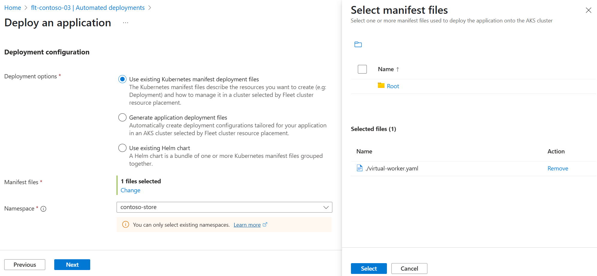 - Stellen Sie die Kubernetes-Manifeste im ausgewählten Namespace im Hubcluster des Flottenmanagers bereit.