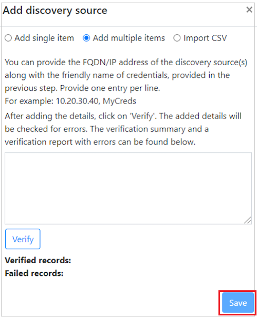 Wenn Sie mehrere Anmeldeinformationen gleichzeitig hinzufügen möchten, wählen Sie "Weitere hinzufügen " aus, um weitere Anmeldeinformationen zu speichern und weitere Anmeldeinformationen einzugeben. Die Appliance unterstützt mehrere Anmeldeinformationen für die physische Serverermittlung.