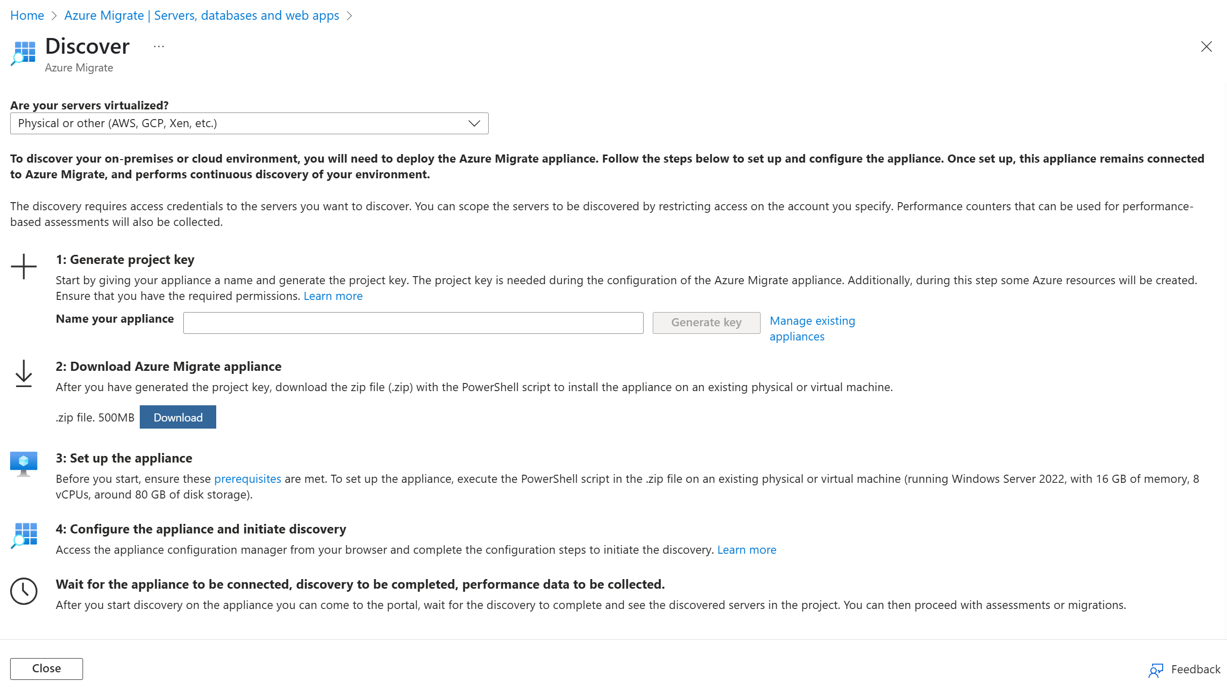 Wenn Sie nicht über den Schlüssel verfügen, wechseln Sie zu Azure Migrate: Discovery and assessment>Overview>Manage existing appliances.