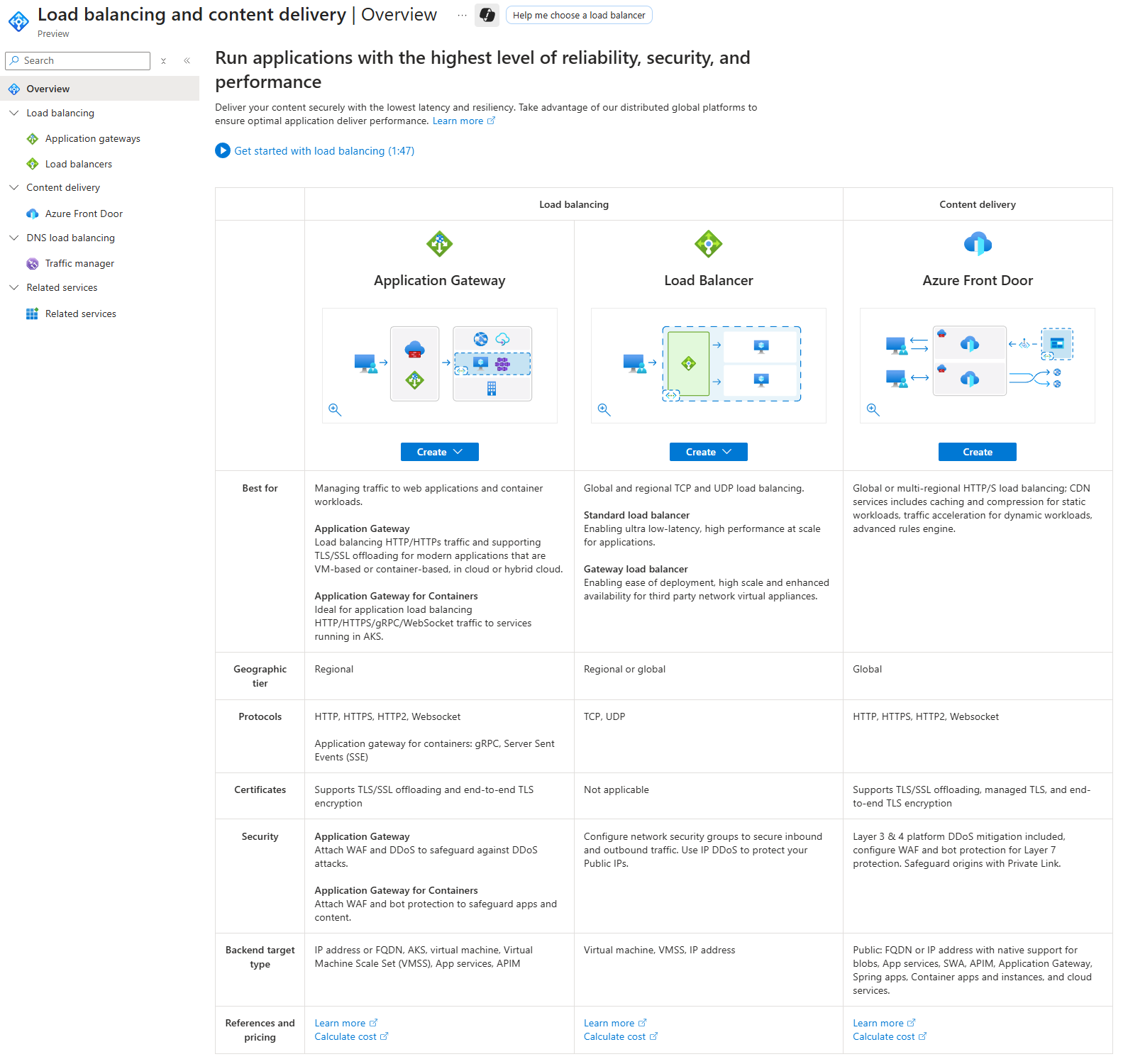 Das Azure-Portal bietet eine zentrale Benutzeroberfläche für die Auswahl von Lastenausgleichs- und Inhaltsbereitstellungsdiensten. Sie können Lastenausgleichsgeräte, Anwendungsgateways und Fronttüren über das Portal erstellen und verwalten. Das Portal bietet eine geführte Erfahrung zum Konfigurieren der Dienste, einschließlich der Einrichtung von Routingregeln, Integritätssonden und anderen Einstellungen.