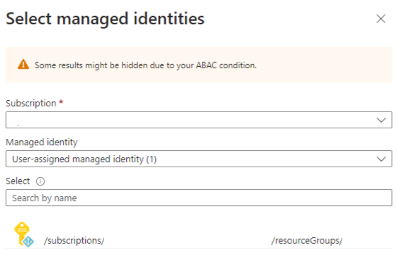 Wählen Sie unter "Mitglieder auswählen" und dann das Abonnement und die vom Benutzer zugewiesene verwaltete Identität im Bereich "Verwaltete Identitäten auswählen " auf der rechten Seite aus.