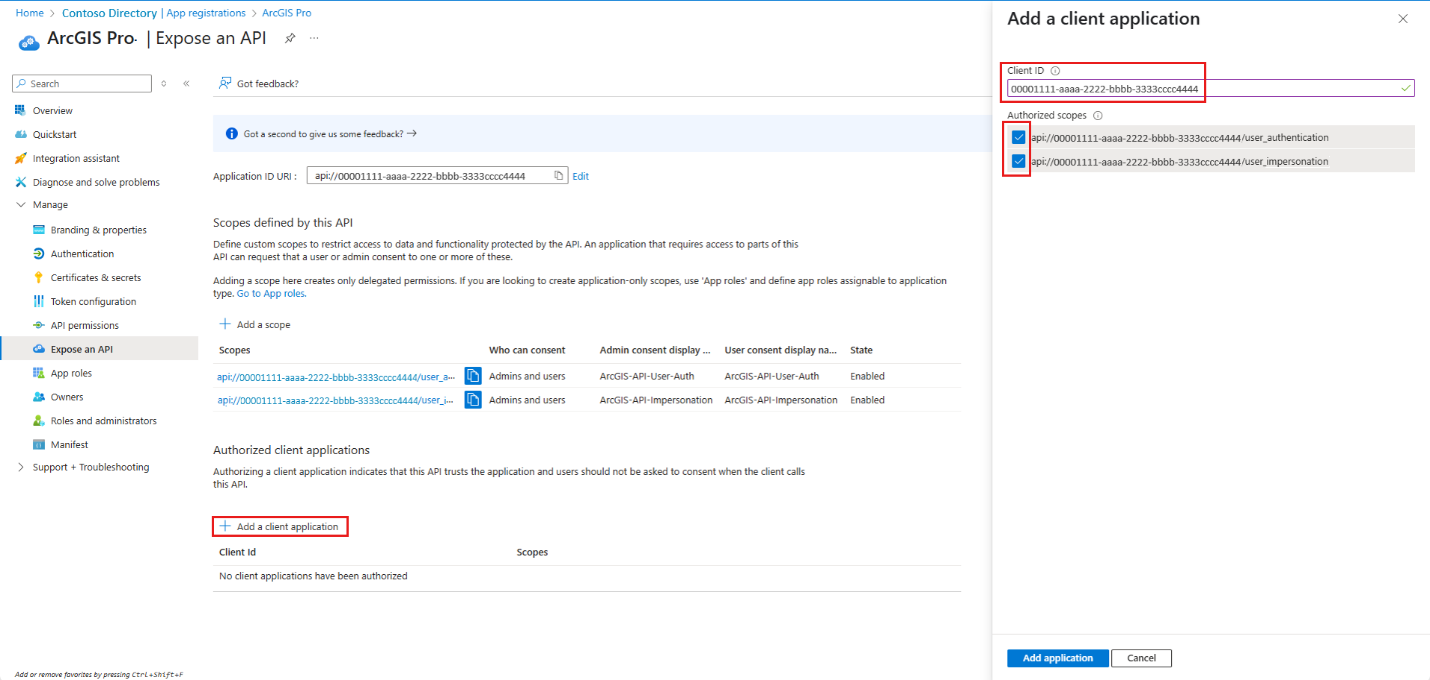 Wählen Sie Client-Anwendung hinzufügen. Wählen Sie die Client-ID aus, und notieren Sie sie. Sie benötigen die Client-ID, um eine Authentifizierungsverbindung in ArcGIS Pro einzurichten.