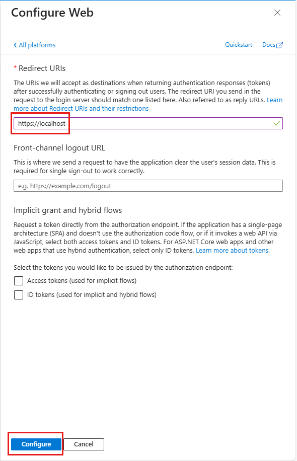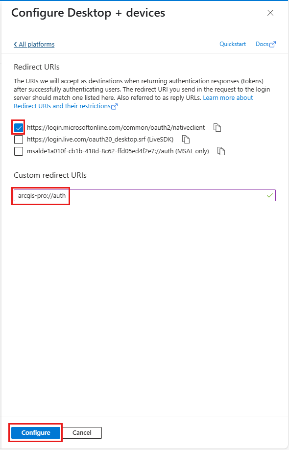 arcgis-pro://authhinzu. Wählen Sie "Konfigurieren" aus.Aktivieren Sie unter Implizite Genehmigung und Hybridflows das Kontrollkästchen ID-Token (für implizite und Hybridflows verwendet). Wählen Sie Speichern aus.