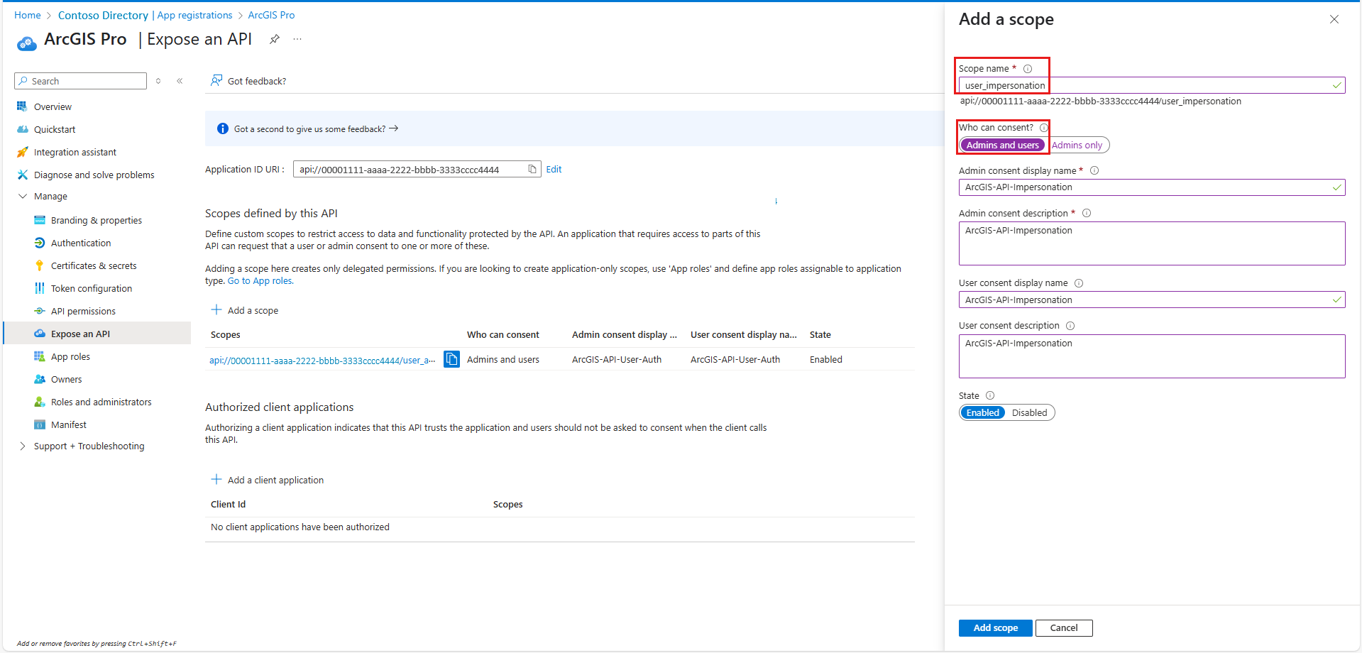 Nachdem Sie Ihre erste Anwendung registriert haben, registrieren Sie eine zweite (mit einem eindeutigen Namen). Die zweite App stellt ArcGIS Pro Desktop dar und konfiguriert ihre API-Berechtigungen. Stellen Sie sicher, dass die neue App auf die Web-API zugreifen kann, die Sie mit der ersten Anwendung verfügbar gemacht haben.