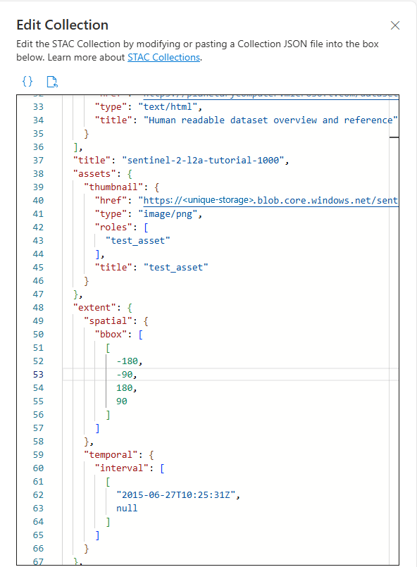 title:assets:thumbnail:href, und kopieren Sie den entsprechenden Wert. Beispiel:https://<unique-storage>.blob.core.windows.net/sentinel-2-l2a-tutorial-1000-<unique-id>/collection-assets/thumbnail/lulc.pngNotieren Sie die Werte unter "Kontoname " und "Containername". Beispiel: