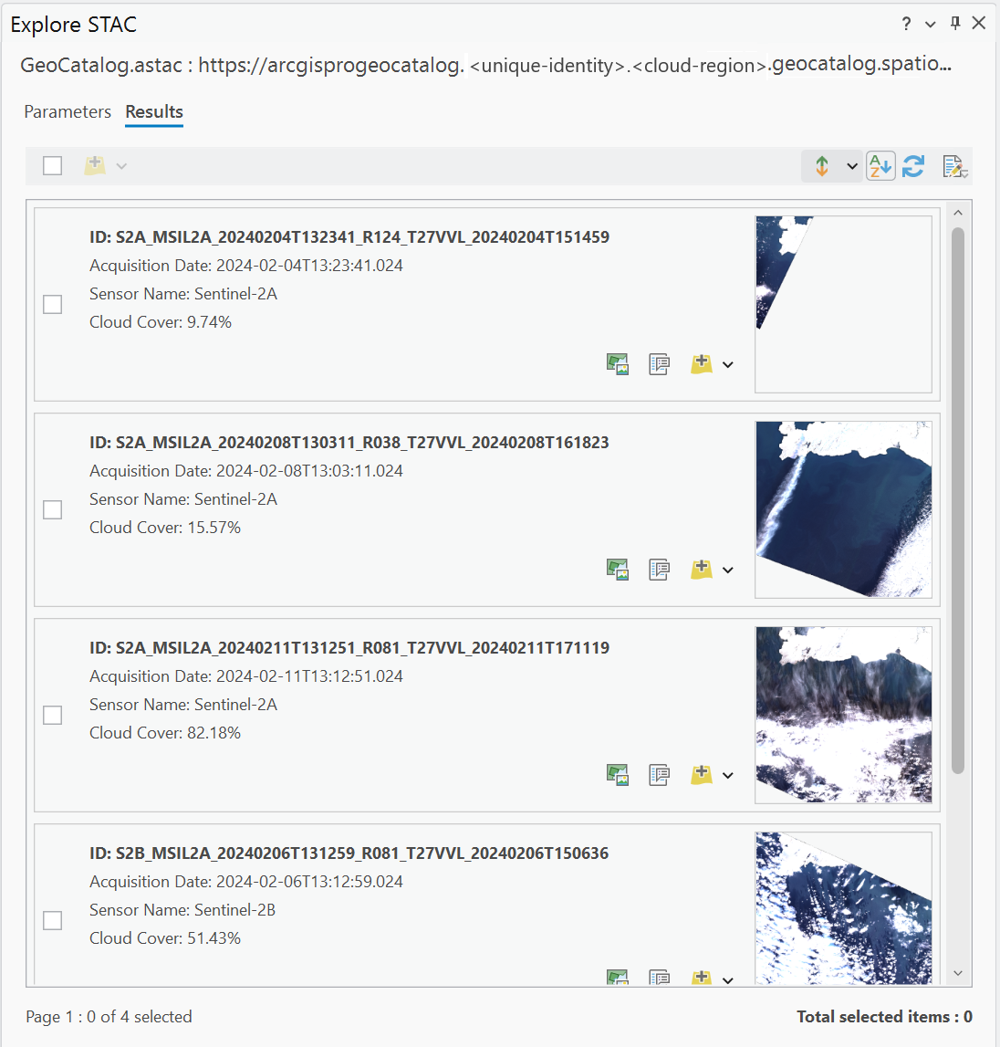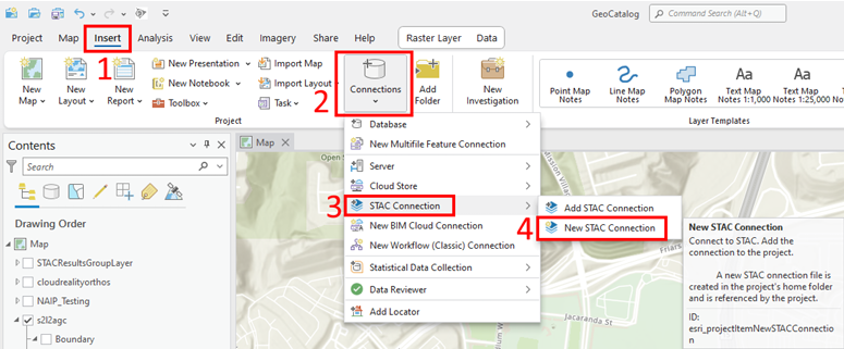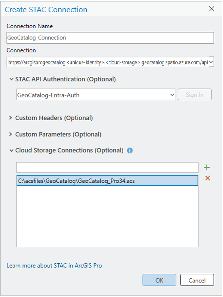 Bitte lesen Sie in der ArcGIS Pro-Dokumentation nach: Erstellen Sie eine STAC-Verbindung.