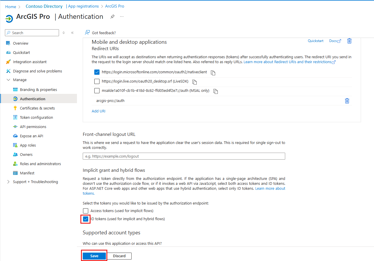 arcgis-pro://authhinzu. - Wählen Sie unter Implizite Genehmigung und Hybridflows die Option ID-Token (werden für implizite und Hybridflows verwendet) aus. Wählen Sie Speichern aus.