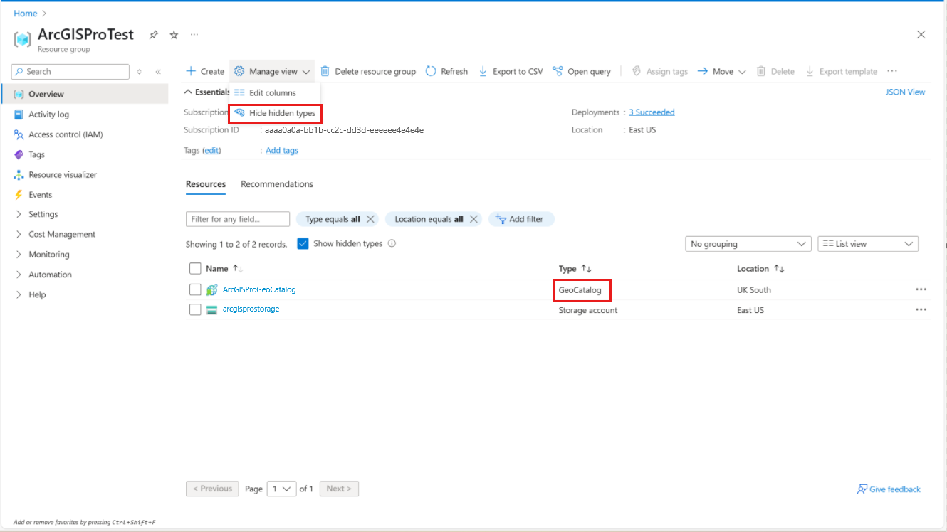 Erstellen Sie einen Microsoft Planetary Computer Pro GeoCatalog in Ihrem Azure-Abonnement (z. B. arcgisprogeocatalog), und suchen Sie ihn in der entsprechenden Ressourcengruppe.