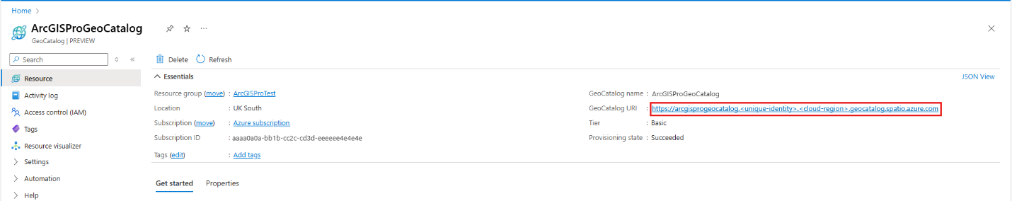 Kopieren Sie den Wert des GeoCatalog-URI. Beispiel: