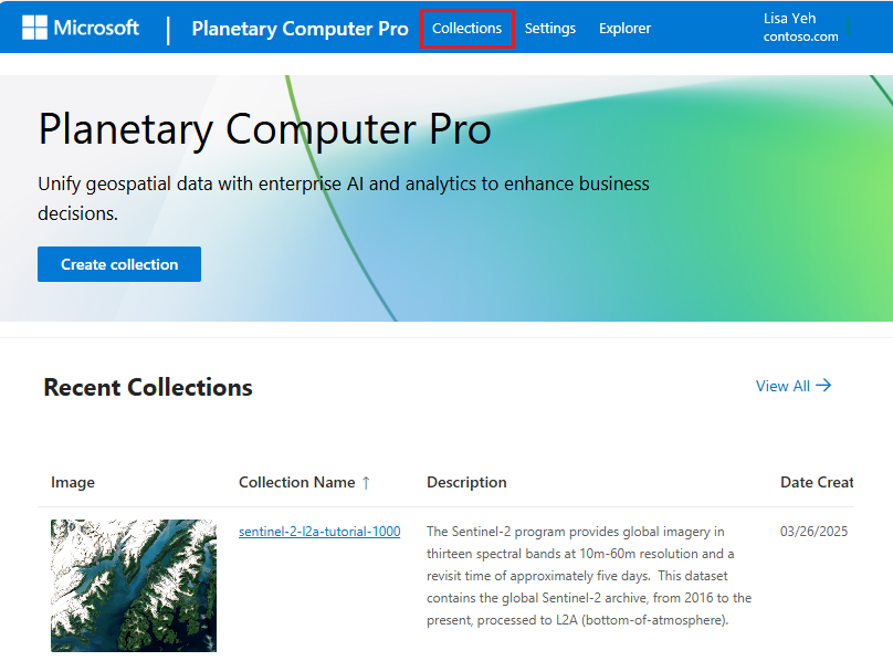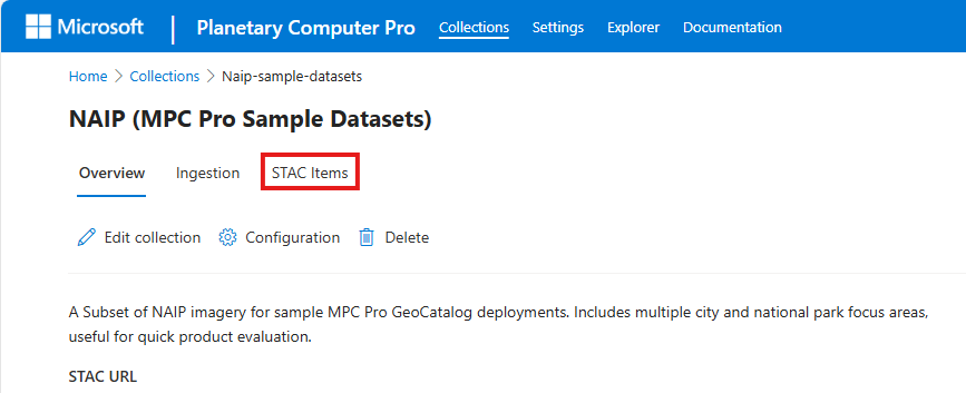 https://arcgisprogeocatalog.<unique-identity>.<cloud-region>.geocatalog.spatio.azure.com.Fügen Sie den Link für Ihren GeoCatalog-URI in den Browser ein, und wählen Sie die Schaltfläche "Sammlungen" aus.