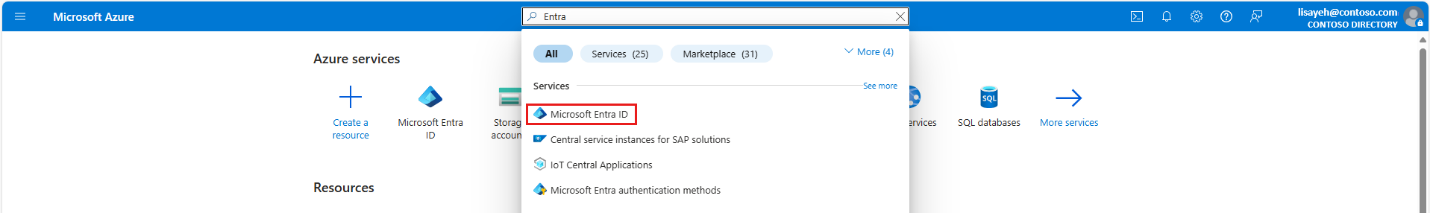 Öffnen Sie das Azure-Portal, und suchen Sie nach Entra. Wählen Sie Microsoft Entra ID aus.